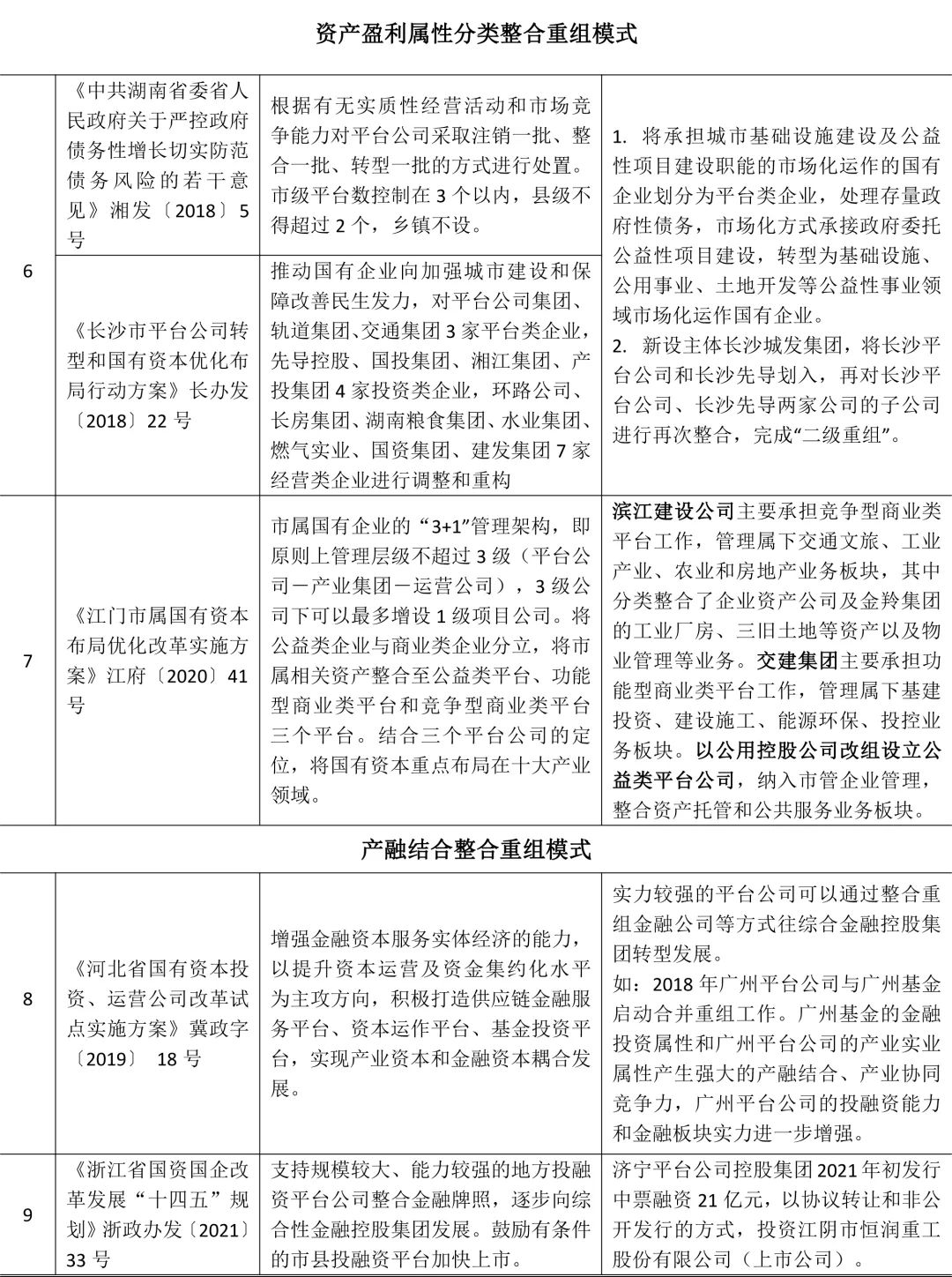 从发布的相关意见、报告等的内容来看,平台公司整合目的常见为两大类:(1)数量整合。部分省份直接限定了平台数量,平台数量控制的参考因素主要是行政级别,市、区县、园区分别限制不同的数量。(2)质量整合。通过归类整合相近业务、重叠板块、类似职能等,明确平台分工,聚焦主责主业,提升企业质量及竞争力。?从发布的相关意见、报告等的标题和出发点来看,主要关键词围绕“债务、融资管理、市场化投融资、高质量发展等”,体现出近期平台公司整合的特征主要包含:(1)提升主体信用评级,优化融资能力,降低债务压力。一般来说,平台公司经过整合后,财务指标都能得以改善,主体评级可能会被上调,带来融资成本降低、融资渠道和融资方式拓宽,有效降低债务压力和债务风险。2020年6月以来,南通沿海开发集团有限公司、青岛西海岸发展集团有限公司、南昌工业控股集团有限公司等通过资产整合,主体信用评级上调至AAA;邵阳市城市建设投资经营集团有限公司、温州市城市建设发展集团有限公司、长沙市望城区城市建设投资集团有限公司等通过资产整合,将信用评级升至AA+。(2)有效发挥母子公司投融资功能统筹协同功能,有效控制债务风险、融资成本和投资成本。因为母公司合并整合后,极大可能能够提升投融资优势,进而提升被合并子公司的投融资优势。(3)寻求政府与平台公司更明晰良性地互动逻辑。平台公司转型发展暗合城市发展规律,后15号文时代,越来越多的地方政府认识到平台公司新的历史价值,及其在地方发展过程中的关键棋子作用,致力将平台公司将打造成为“市县政府谋划实施建设项目的重要依托和支撑高质量发展的重要载体”和“带动区域经济发展的重要力量”。因此,在规范政府融资和控制政府债务风险的框架内,更应主动厘清地方政府与平台公司的关系,高位推动支持平台企业从业务体系到管理体系、从基本技能到专业技能去全面“武装”自身。(4)从资产整合的对象来看,以上政策内容与举措更多是基于2015-2018年现金流要求为导向的资本性资产整合为主要特征,以实现企业自身造血功能的增强,扩大债务市场融资能力。资产整合重组方式表现为对平台公司进行供排水、垃圾处理、燃气供应、城市广告经营权等可经营性资产的注入。(5)资产注入方式不再完全依靠政府划拨,开始注重资产的价值性考量,不过于依赖以前简单粗暴的资产直接划拨方式,转向根据企业自身业务发展需要来进行资产整合重组。(6)经营性资产占比开始上升,在推进资产整合重组的过程中,为提升企业市场化融资能力,更专注经营性和准经营性资产资源注入,推进构建平台公司的核心竞争优势和自身造血功能。(7)开始改变过往整合重组完成后管理不足的问题,资产管理能力有所提升。开始对资产依据业务板块实行分类管理、分业运作,以资本融资为需求推动业务“整合运作”,有效实现企业资产的集中有效配置和运作。综上,在“注重内容、整合统一”的资产整合重组模式下,平台依靠经营性和准经营性的注入,开始构建其核心竞争力优势、自身造血功能、市场投融资能力,奠定企业转型发展的底蕴基础。通过对2018年至今的平台公司整合政策与实践梳理,按照整合的动机与效用,将资产整合模式分为:跨(淡)层级、跨(淡)区域、跨(淡)属性整合重组模式;产业链整合重组模式;资产盈利属性分类整合重组模式;产融结合类整合重组模式。具体政策依据、整合形式(见表2-2)。