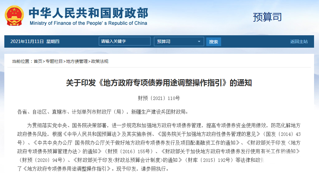 11月11日,财政部印发《地方政府专项债券用途调整操作指引》。其中提到,专项债券资金使用,坚持以不调整为常态、调整为例外。专项债券一经发行,应当严格按照发行信息公开文件约定的项目用途使用债券资金,各地确因特殊情况需要调整的,应当严格履行规定程序,严禁擅自随意调整专项债券用途,严禁先挪用、后调整等行为。专项债券资金已安排的项目,可以申请调整的具体情形包括:(一)项目实施过程中发生重大变化,确无专项债券资金需求或需求少于预期的;(二)项目竣工后,专项债券资金发生结余的;(三)财政、审计等发现专项债券使用存在违规问题,按照监督检查意见或审计等意见确需调整的;(四)其他需要调整的。专项债券用途调整,应符合以下原则:(一)调整安排的项目必须经审核把关具备发行和使用条件。项目属于有一定收益的公益性项目,且预期收益与融资规模自求平衡。项目前期准备充分、可尽早形成实物工作量。项目周期应当与申请调整的债券剩余期限相匹配。(二)调整安排的专项债券资金,优先支持党中央、国务院明确的重点领域符合条件的重大项目。(三)调整安排的专项债券资金,优先选择与原已安排的项目属于相同类型和领域的项目。确需改变项目类型的,应当进行必要的解释说明。(四)调整安排的专项债券资金,严禁用于置换存量债务,严禁用于楼堂馆所、形象工程和政绩工程以及非公益性资本支出项目,依法不得用于经常性支出。