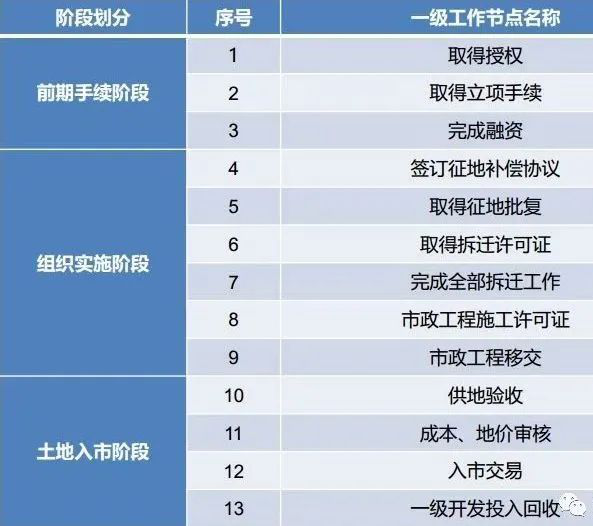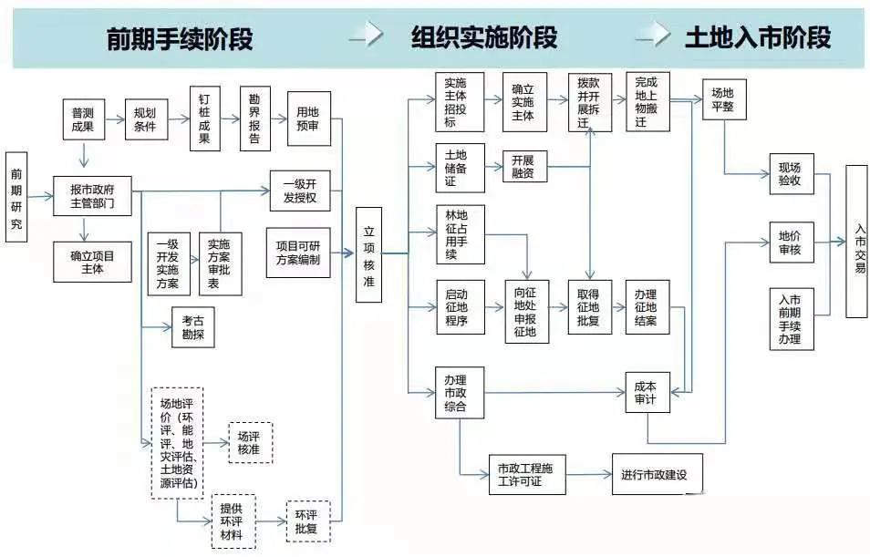 土地一级阶段包括“前期手续阶段”、“组织实施阶段”和“土地入市阶段”。