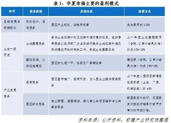 主要盈利模式:一是通过垫付园区前期开发、基础设施建设费,获得政府10%~15%的利息收入;二是园区招商引资返还收入,即园区新增固定资产投资额或新增财政收入的45%;三是园区配套地产开发收入;四是园区土地升值收益。
